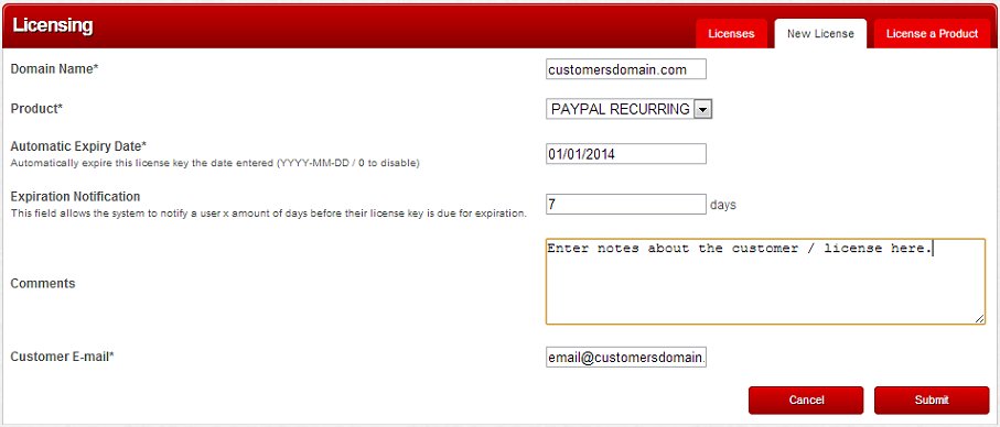 License a product to any domain whenever you need, or have a license key created automatically on PayPal checkout. You can deactivate any license whenever you want or have it deactivate automatically after a certain amount of time or if a customer cancels a subscription. Great for free trials or deactivating clients automatically whenever they make a charge back!